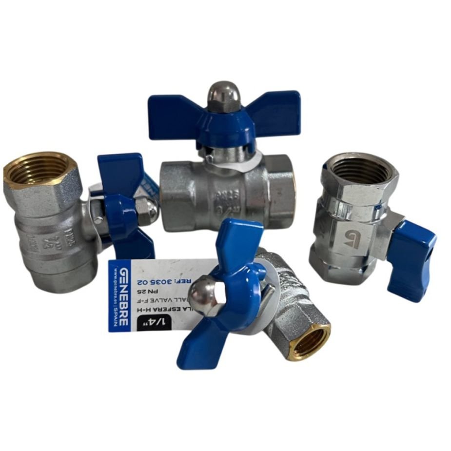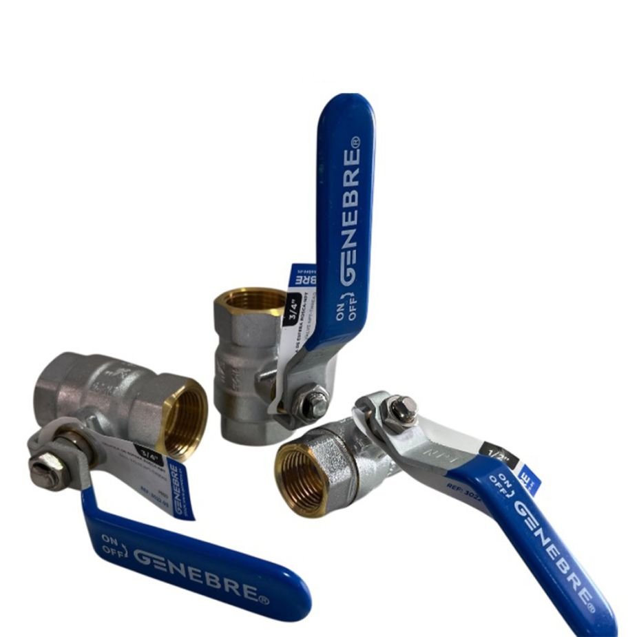 La válvula de bola o valvulas de esfera GENEBRE son válvula de paso total fabricadas en en latón niquelado, laton natural, bronce, acero inoxidable, acero carbon WCB, diseñada para ofrecer máxima estanqueidad, durabilidad y facilidad de operación en aplicaciones de conducción de agua, aire, gas o aceite. Gracias a su diseño robusto y su bola de accionamiento suave, la válvula Genebre garantiza un control eficiente del flujo con mínima pérdida de presión, ideal para instalaciones industriales, hidráulicas y de fontanería profesional.